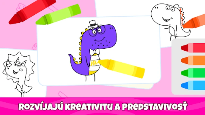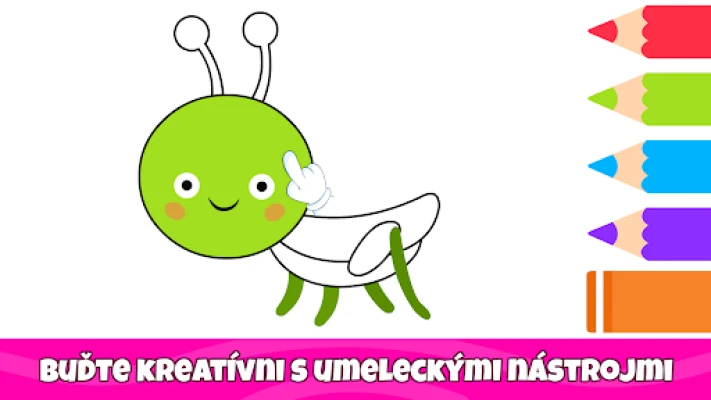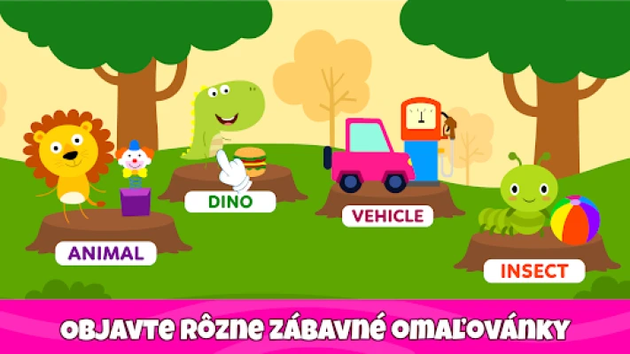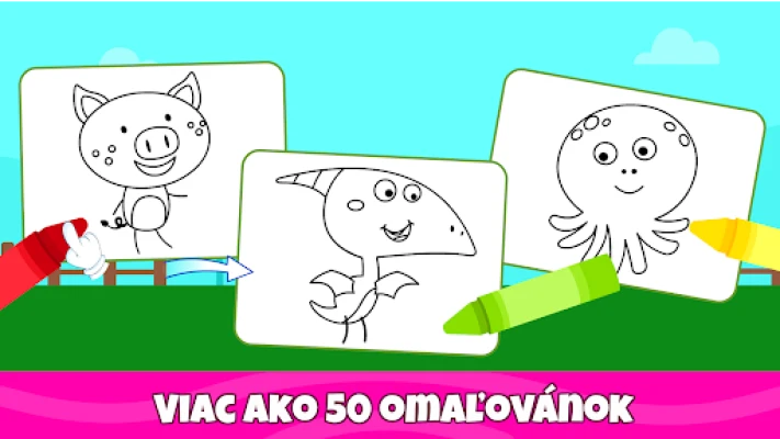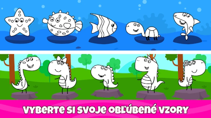 Nechajte svoje batoľatá a predškolákov ponoriť sa do sveta maľovania bez obmedzení. S jednoduchým a intuitívnym ovládaním, ktoré je prispôsobené malým prstom, môžu deti vyfarbovať a tvoriť donekonečna. Táto aplikácia ponúka rozsiahlu kolekciu obrázkov, rozdelených do pútavých kategórií: divoké a domáce **Zvieratá**, malí a zaujímaví **Hmyz**, rýchle **Vozidlá**, prehistorickí **Dinosaury** a tajomné **Podvodné živočíchy**. Každá sekcia je plná roztomilých ilustrácií, ktoré vyzývajú deti vo veku 1, 2, 3, 4 a 5 rokov k vlastnému umeleckému vyjadreniu a zároveň ich dlhodobo zabavia.